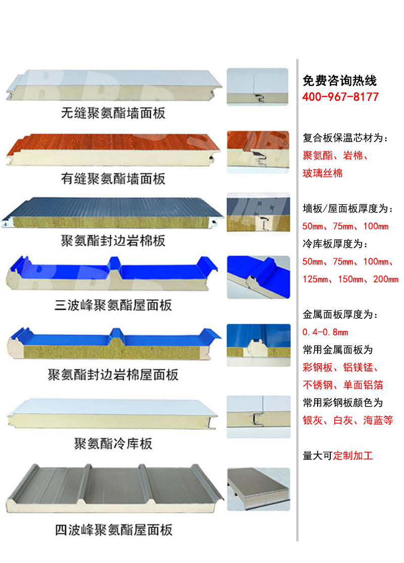 寶潤(rùn)達(dá)聚氨酯夾芯板廠(chǎng)家可生產(chǎn)各種規(guī)格聚氨酯夾芯板,歡迎來(lái)廠(chǎng)參觀,咨詢(xún)熱線(xiàn):400-967-8177 15617763117