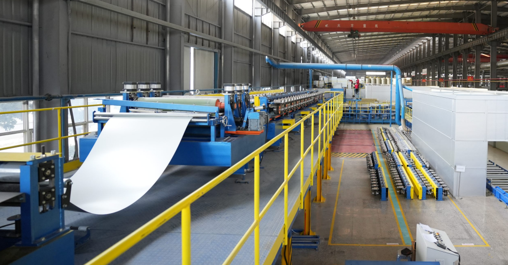 寶潤(rùn)達(dá)新材企口鋁板保溫一體板與保溫材料在熱壓生產(chǎn)線 進(jìn)行除塵、噴膠、壓制一體成型,可以做到6分鐘快速成品。